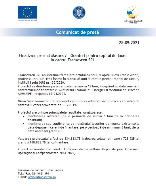 Anunta incheierea proiectului cu titlul " masura 2" proiect nr rue 10657 înscris în cadrul măsurii "granturi pentru capital de lucru", instituită prin oug nr 130/2020... .. Proiectul se derulează pe o perioada de maxim 12 luni, începând cu data semnării contractului de finanțare cu ministerul economiei, energiei si mediului de.